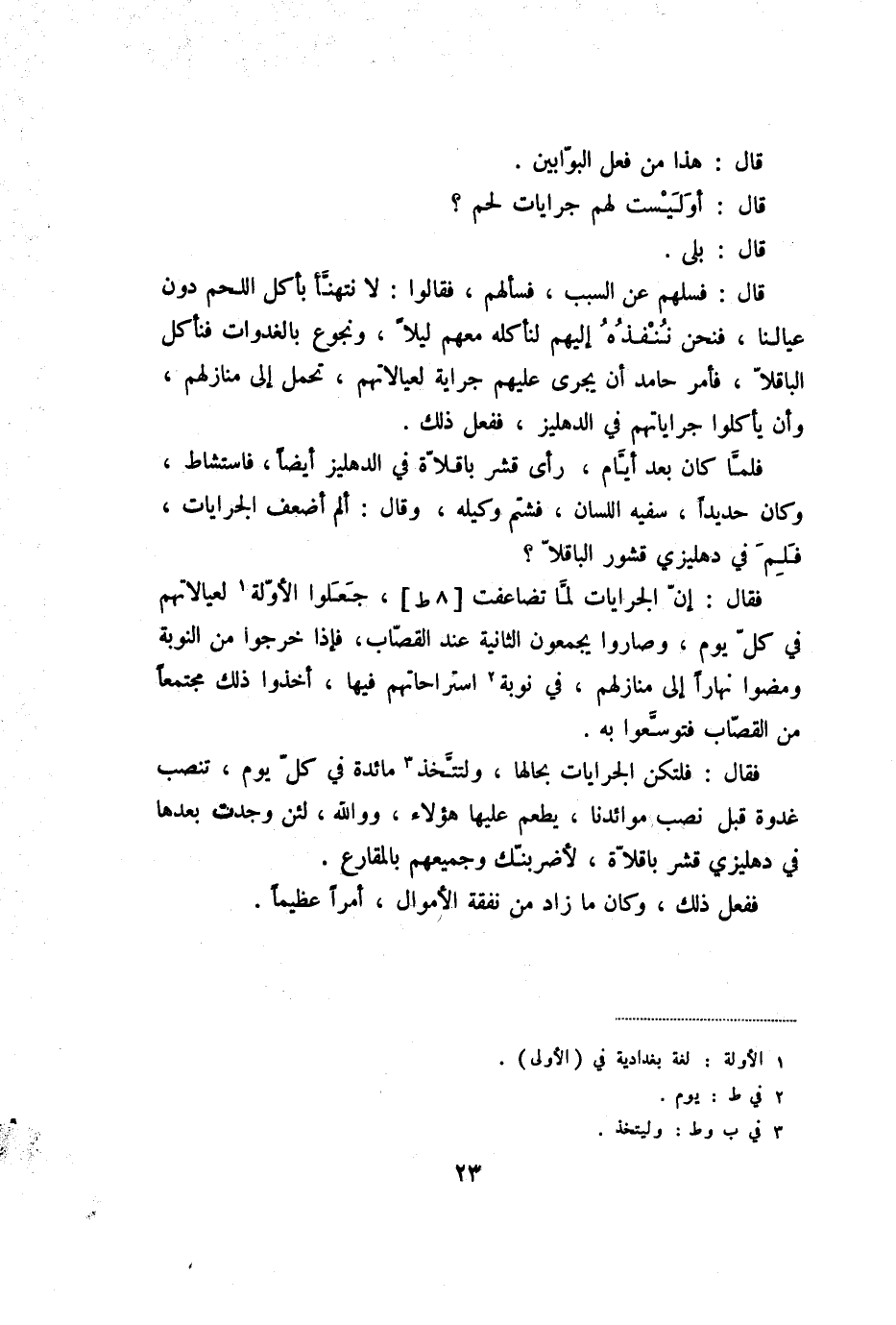 فقال: إنّ الجرايات لمّا تضاعفت [8 ط] ، جعلوا الأوّلة «1» لعيالاتهم في كلّ يوم، وصاروا يجمعون الثانية عند القصّاب، فإذا خرجوا من النوبة ومضوا نهارا إلى منازلهم، في نوبة «2» استراجاتهم فيها، أخذوا ذلك مجتمعا من القصّاب فتوسّعوا به.