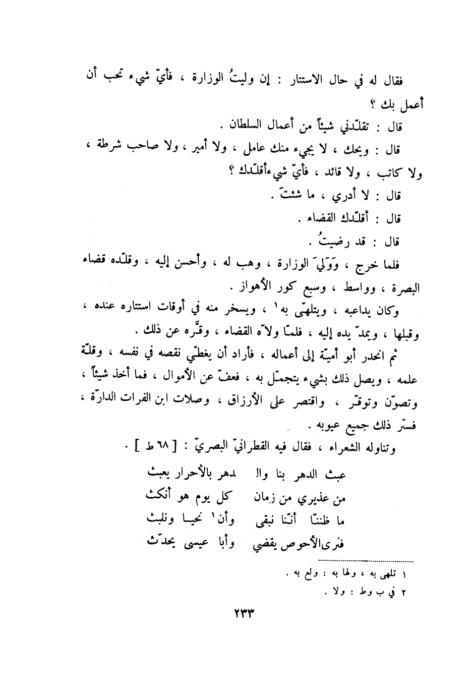 وكان يداعبه، ويتلهّى به «1» ، ويسخر منه في أوقات استتاره عنده، وقبلها، ويمدّ يده إليه، فلمّا ولّاه القضاء، وقرّه عن ذلك.