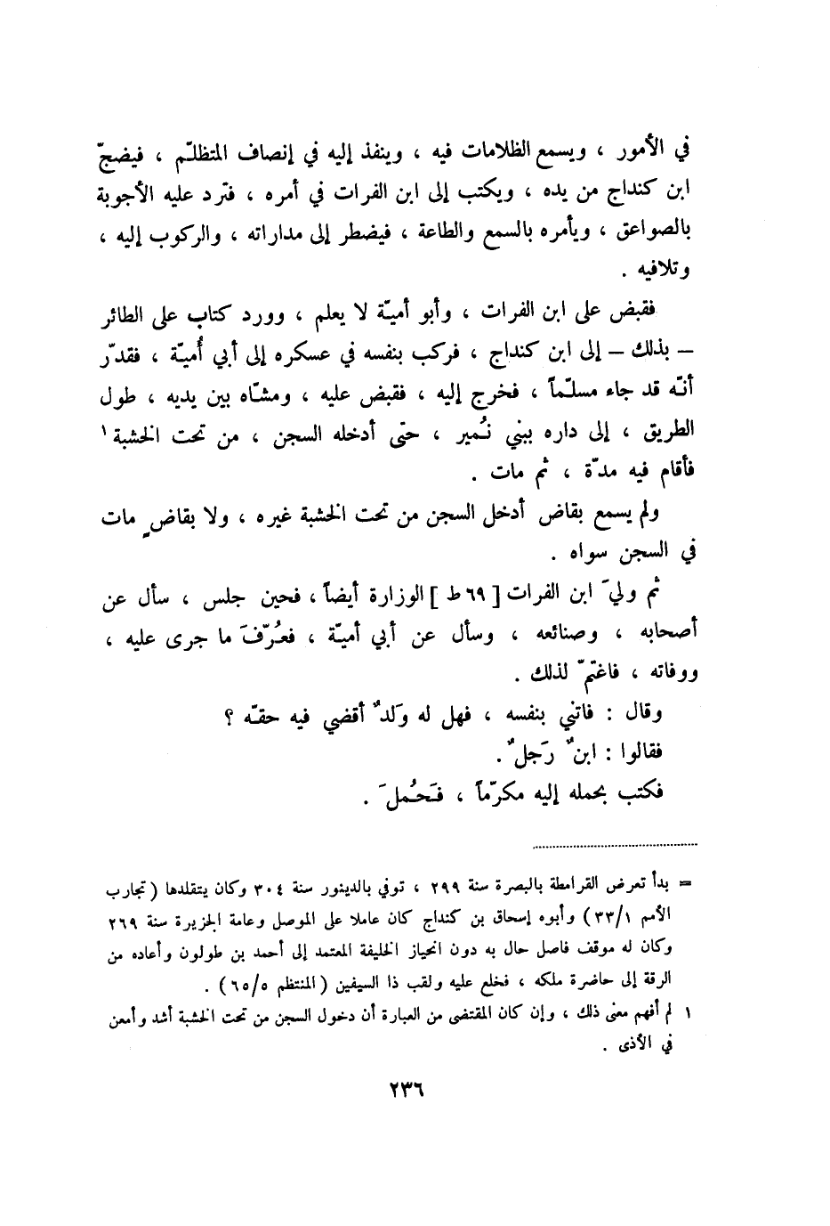 فقبض على ابن الفرات، وأبو أميّة لا يعلم، وورد كتاب على الطائر- بذلك- إلى ابن كنداج، فركب بنفسه في عسكره إلى أبي أميّة، فقدّر أنّه قد جاء مسلّما، فخرج إليه، فقبض عليه، ومشّاه بين يديه، طول الطريق، إلى داره ببني نمير، حتى أدخله السجن، من تحت الخشبة «1» فأقام فيه مدّة، ثم مات.