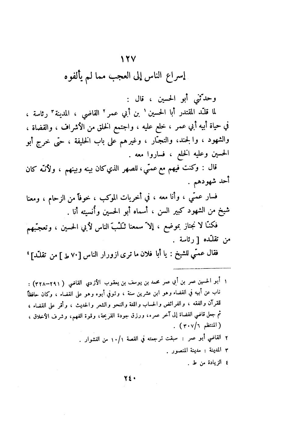لما قلّد المقتدر أبا الحسين «1» بن أبي عمر «2» القاضي، المدينة «3» رئاسة، في حياة أبيه أبي عمر، خلع عليه، واجتمع الخلق من الأشراف، والقضاة، والشهود، والجند، والتجّار، وغيرهم على باب الخليفة، حتى خرج أبو الحسين وعليه الخلع، فساروا معه.