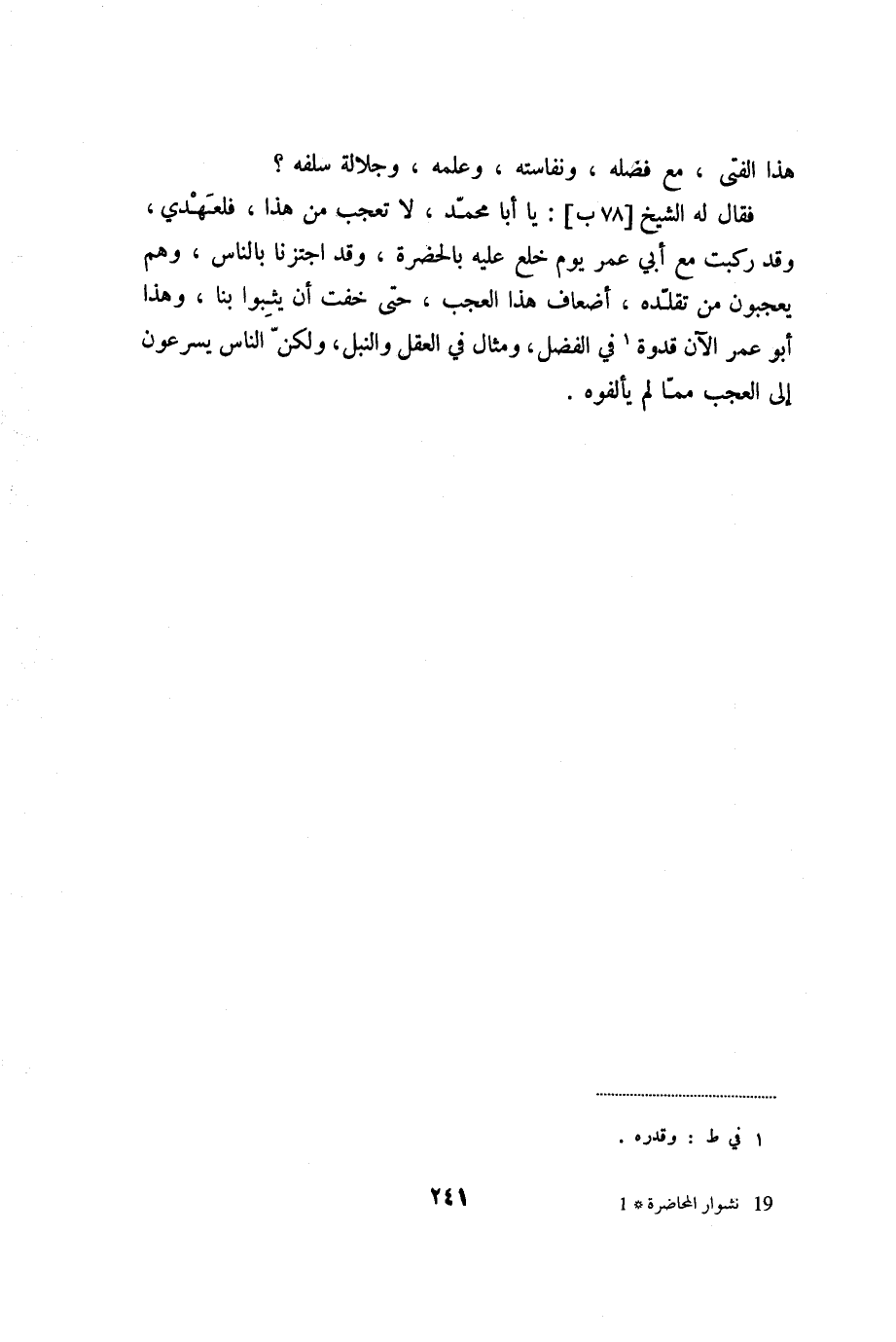 فقال له الشيخ [78 ب] : يا أبا محمّد، لا تعجب من هذا، فلعهدي، وقد ركبت مع أبي عمر يوم خلع عليه بالحضرة، وقد اجتزنا بالناس، وهم يعجبون من تقلّده، أضعاف هذا العجب، حتى خفت أن يثبوا بنا، وهذا أبو عمر الآن قدوة «1» في الفضل، ومثال في العقل والنبل، ولكنّ الناس يسرعون إلى العجب ممّا لم يألفوه.