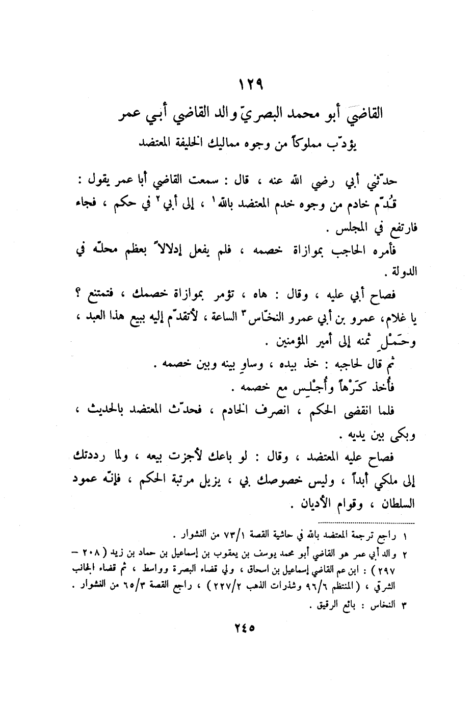 129 القاضي أبو محمد البصريّ والد القاضي أبي عمر يؤدّب مملوكا من وجوه مماليك الخليفة المعتضد