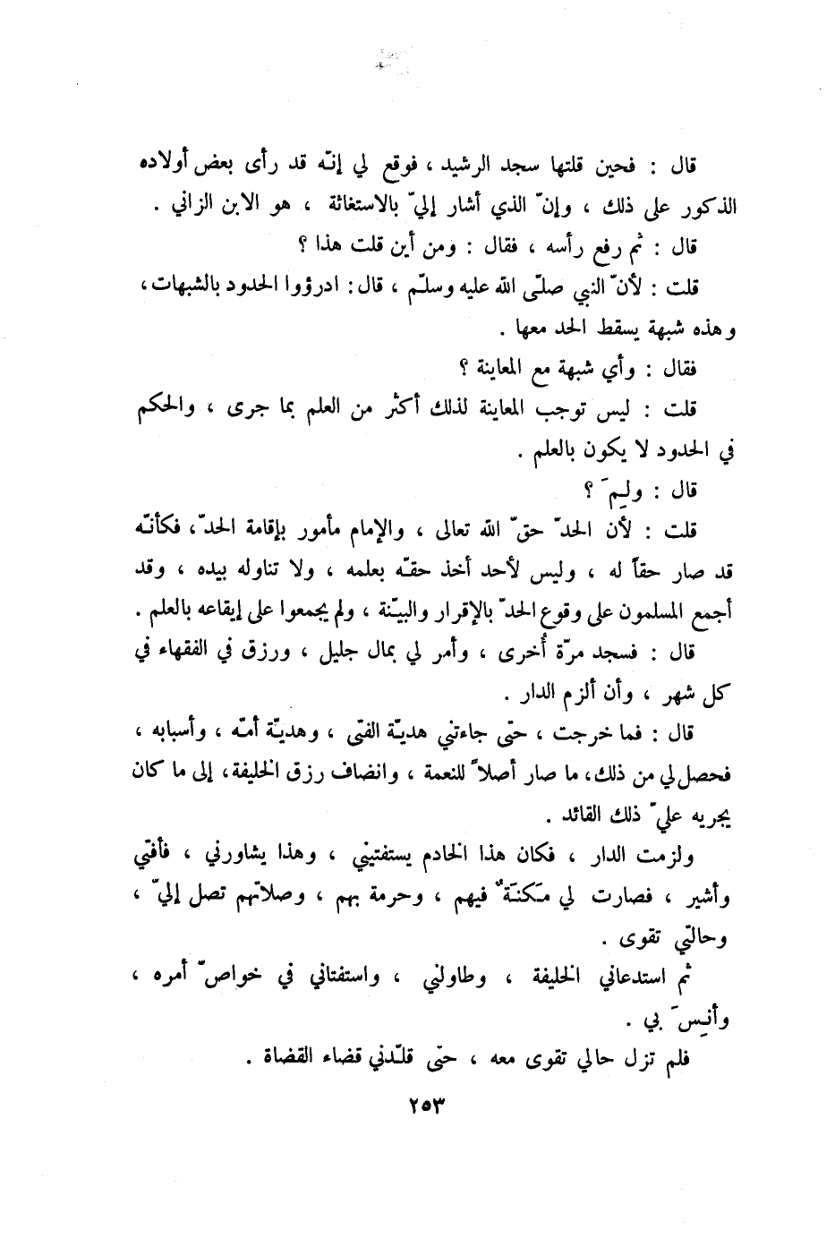 قال: فسجد مرّة أخرى، وأمر لي بمال جليل، ورزق في الفقهاء في كل شهر، وأن ألزم الدار.