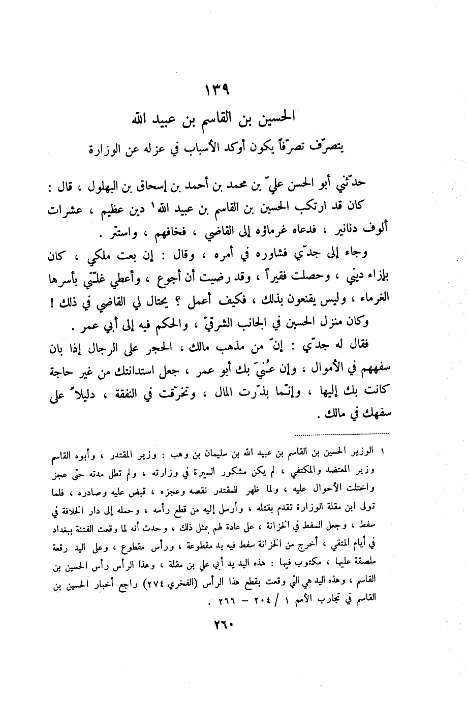 139 الحسين بن القاسم بن عبيد الله يتصرّف تصرّفا يكون أوكد الأسباب في عزله عن الوزارة