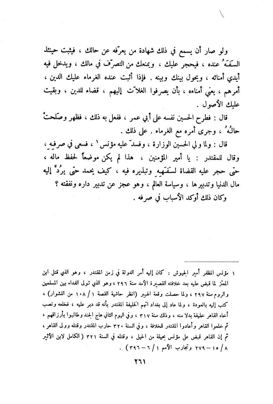 قال: ولما ولي الحسين الوزارة، وفسد عليه مؤنس «1» ، فسعى في صرفه، وقال للمقتدر: يا أمير المؤمنين، هذا لم يكن موضعا لحفظ ماله، حتى حجر عليه القضاة لسفهه وتبذيره فيه، كيف يحمد حتى يردّ إليه مال الدنيا وتدبيرها، وسياسة العالم، وهو عجز عن تدبير داره ونفقته؟