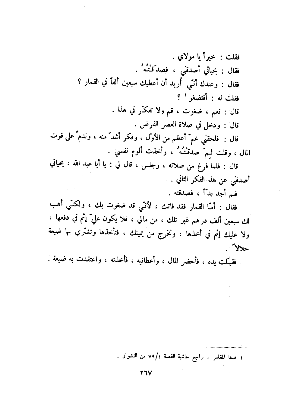 فقال: أمّا القمار فقد فاتك، لأنّي قد ضغوت بك، ولكنّي أهب لك سبعين ألف درهم غير تلك، من مالي، فلا يكون عليّ إثم في دفعها، ولا عليك إثم في أخذها، وتخرج من يمينك، فتأخذها وتشتري بها ضيعة حلالا.
