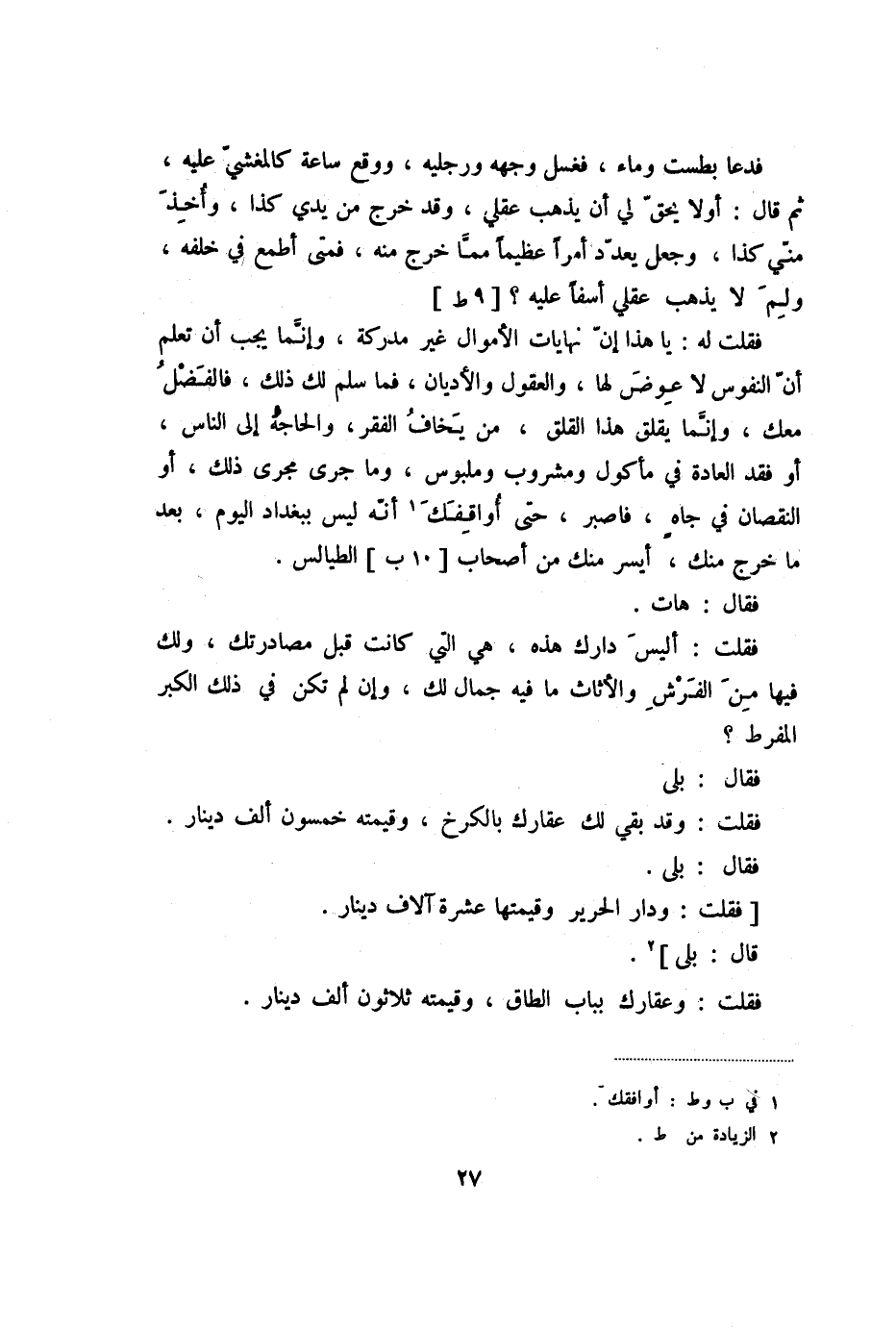 فدعا بطست وماء، فغسل وجهه ورجليه، ووقع ساعة كالمغشيّ عليه، ثم قال: أولا يحقّ لي أن يذهب عقلي، وقد خرج من يدي كذا، وأخذ منّي كذا، وجعل يعدّد أمرا عظيما ممّا خرج منه، فمتى أطمع في خلفه، ولم لا يذهب عقلي أسفا عليه؟ [9 ط] فقلت له: يا هذا إنّ نهايات الأموال غير مدركة، وإنّما يجب أن تعلم أنّ النفوس لا عوض لها، والعقول والأديان، فما سلم لك ذلك، فالفضل معك، وإنّما يقلق هذا القلق، من يخاف الفقر، والحاجة إلى الناس، أو فقد العادة في مأكول ومشروب وملبوس، وما جرى مجرى ذلك، أو النقصان في جاه، فاصبر، حتى أواقفك «1» أنّه ليس ببغداد اليوم، بعد ما خرج منك، أيسر منك من أصحاب [10 ب] الطيالس.
