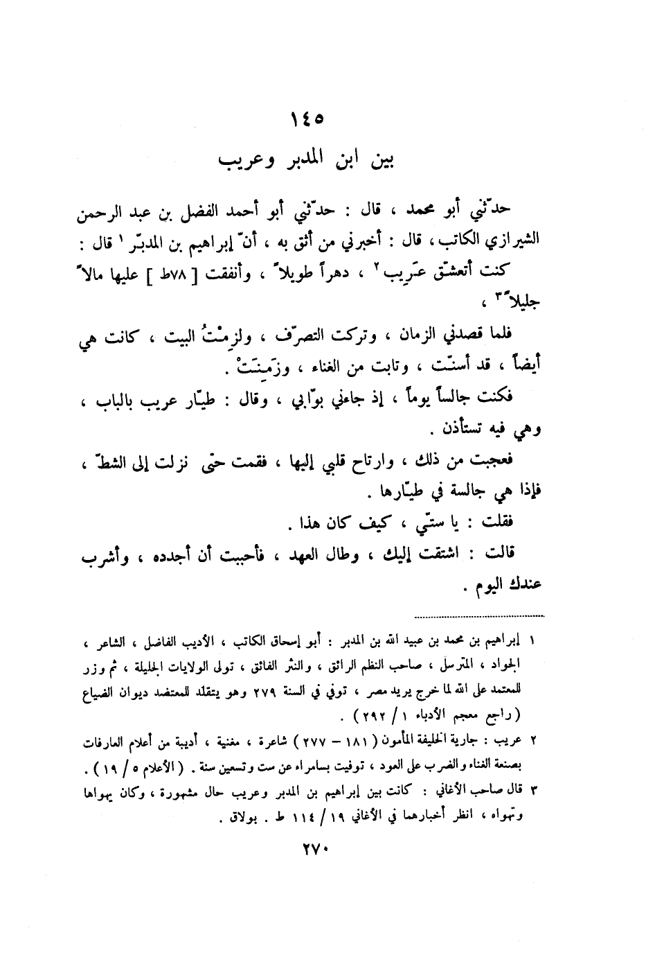 كنت أتعشّق عريب «2» ، دهرا طويلا، وأنفقت [78 ط] عليها مالا جليلا «3» ، فلما قصدني الزمان، وتركت التصرّف، ولزمت البيت، كانت هي أيضا، قد أسنّت، وتابت من الغناء، وزمنت.