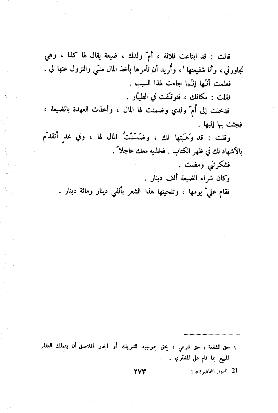 قالت: قد ابتاعت فلانة، أمّ ولدك، ضيعة يقال لها كذا، وهي تجاورني، وأنا شفيعتها «1» ، وأريد أن تأمرها بأخذ المال منّي والنزول عنها لي.