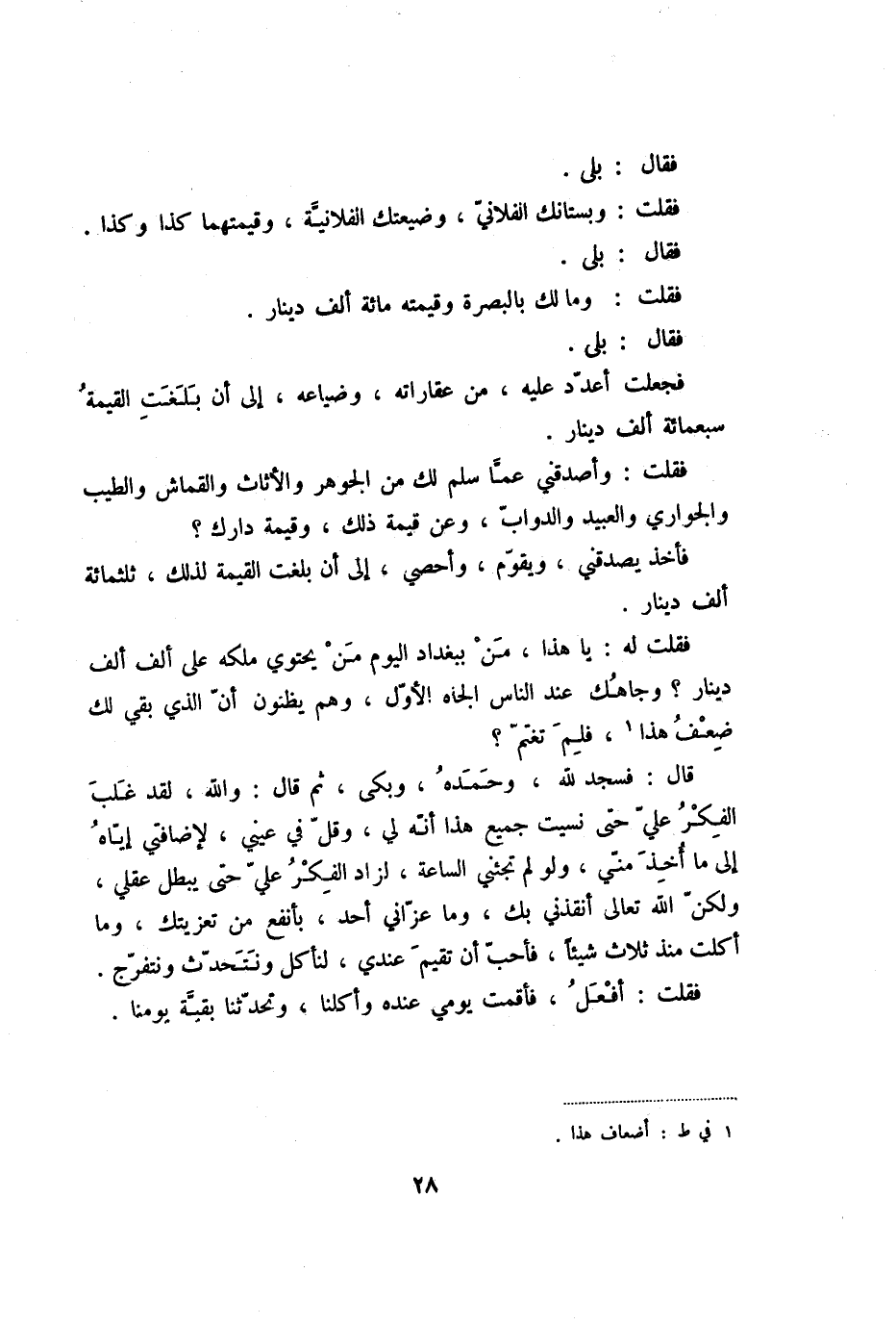 فقلت له: يا هذا، من ببغداد اليوم من يحتوي ملكه على ألف ألف دينار؟ وجاهك عند الناس الجاه الأوّل، وهم يظنون أنّ الذي بقي لك ضعف هذا «1» ، فلم تغتمّ؟