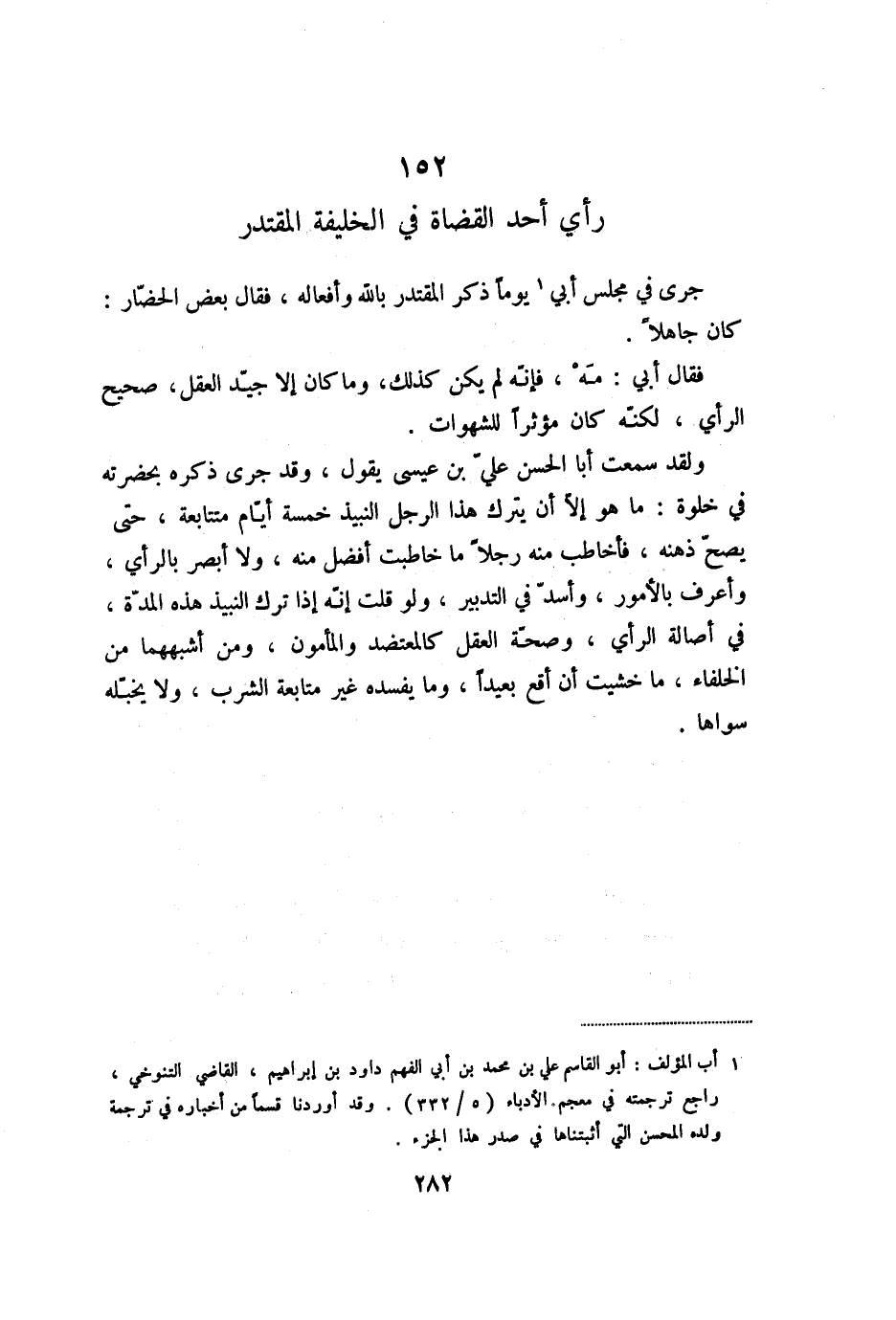 ولقد سمعت أبا الحسن عليّ بن عيسى يقول، وقد جرى ذكره بحضرته في خلوة: ما هو إلّا أن يترك هذا الرجل النبيذ خمسة أيّام متتابعة، حتى يصحّ ذهنه، فأخاطب منه رجلا ما خاطبت أفضل منه، ولا أبصر بالرأي، وأعرف بالأمور، وأسدّ في التدبير، ولو قلت إنّه إذا ترك النبيذ هذه المدّة، في أصالة الرأي، وصحّة العقل كالمعتضد والمأمون، ومن أشبههما من الخلفاء، ما خشيت أن أقع بعيدا، وما يفسده غير متابعة الشرب، ولا يخبّله سواها.