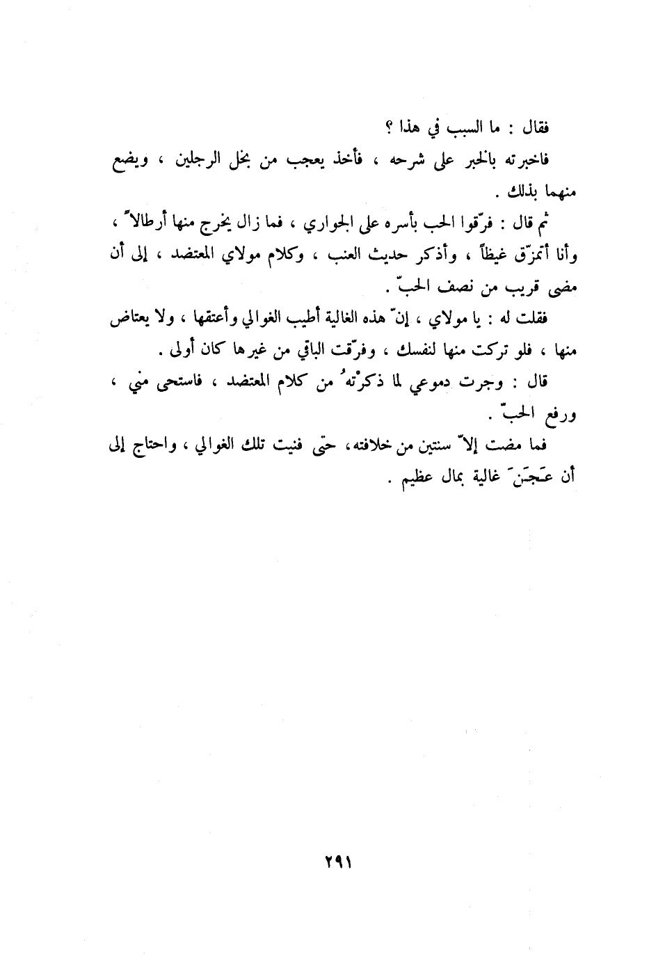 فاخبرته بالخبر على شرحه، فأخذ يعجب من بخل الرجلين، ويضع منهما بذلك.