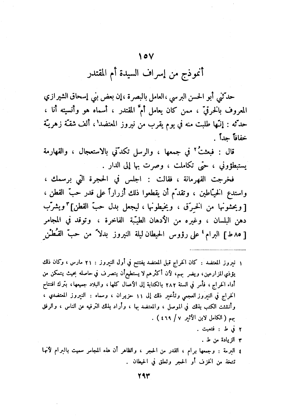 فخرجت القهرمانة، فقالت: اجلس في الحجرة التي برسمك، واستدع الخيّاطين، وتقدّم أن يقطعوا ذلك أزرارا على قدر حبّ القطن، [ويحشونها من الخرق، ويخيطونها، ليجعل بدل حبّ القطن] «3» ويشرّب دهن البلسان، وغيره من الأدهان الطيّبة الفاخرة، وتوقد في المجامر [85 ط] البرام «4» على رؤوس الحيطان ليلة النيروز بدلا من حبّ القطن