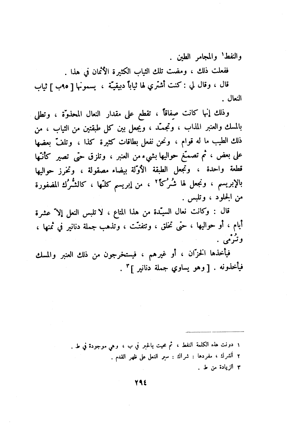 وذلك إنها كانت صفاقا، تقطع على مقدار النعال المحذوّة، وتطلى بالمسك والعنبر المذاب، وتجمّد، ويجعل بين كل طبقتين من الثياب، من ذلك الطيب ما له قوام، ونحن نفعل بطاقات كثيرة كذا، وتلفّ بعضها على بعض، ثم تصمّغ حواليها بشيء من العنبر، وتلزق حتى تصير كأنّها قطعة واحدة، وتجعل الطبقة الأوّلة بيضاء مصقولة، وتخرز حواليها بالإبريسم، ونجعل لها شركا «2» ، من إبريسم كلّها، كالشّرك المضفورة من الجلود، وتلبس.