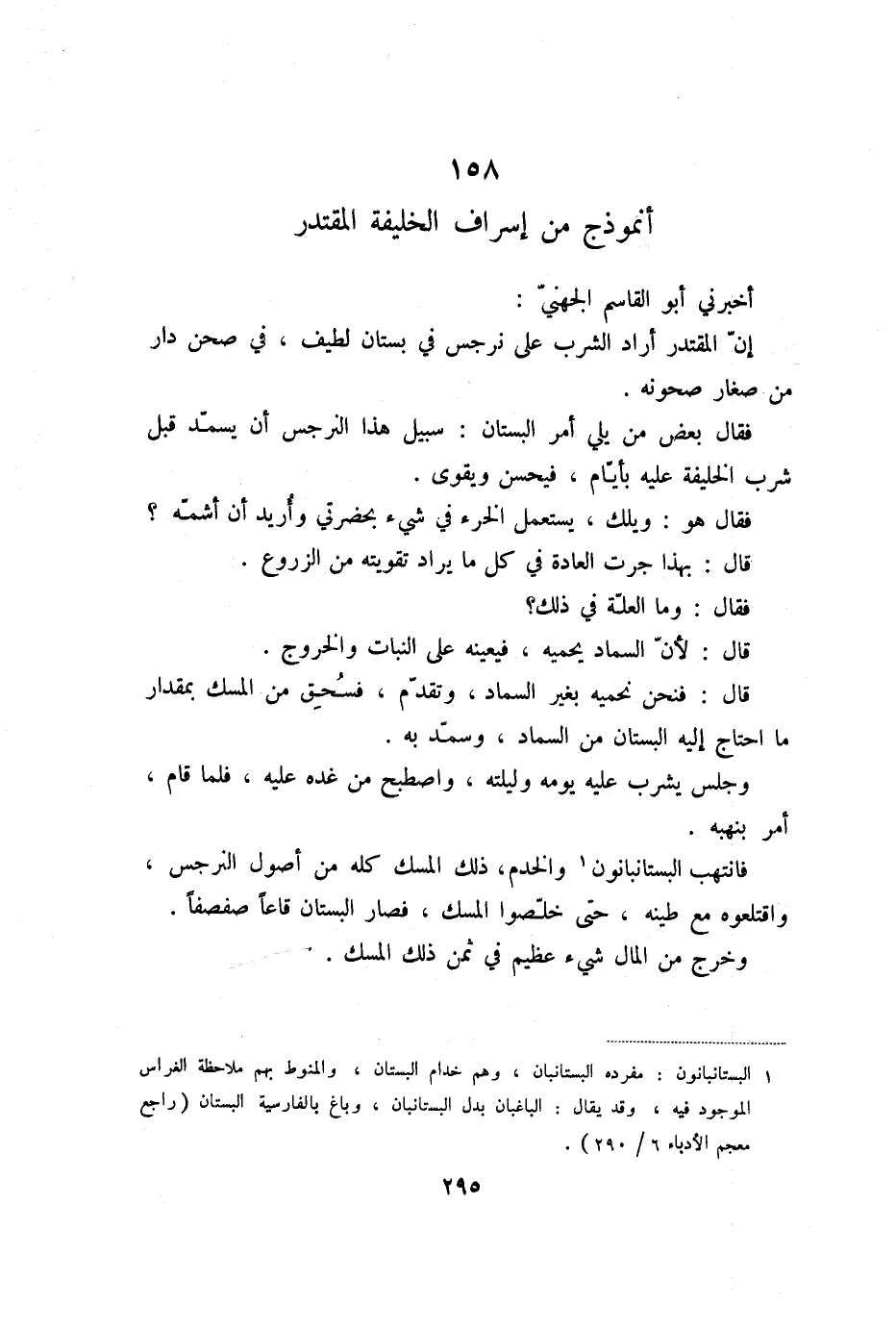 إنّ المقتدر أراد الشرب على نرجس في بستان لطيف، في صحن دار من صغار صحونه.
