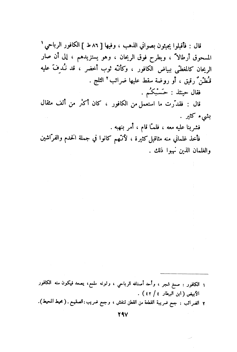 قال: فأقبلوا يجيئون بصواني الذهب، وفيها [86 ط] الكافور الرباحي «1» المسحوق أرطالا، ويطرح فوق الريحان، وهو يستزيدهم، إلى أن صار الريحان كالمغطّى ببياض الكافور، وكأنّه ثوب أخضر، قد ندف عليه قطن رقيق، أو روضة سقط عليها ضرائب «2» الثلج.