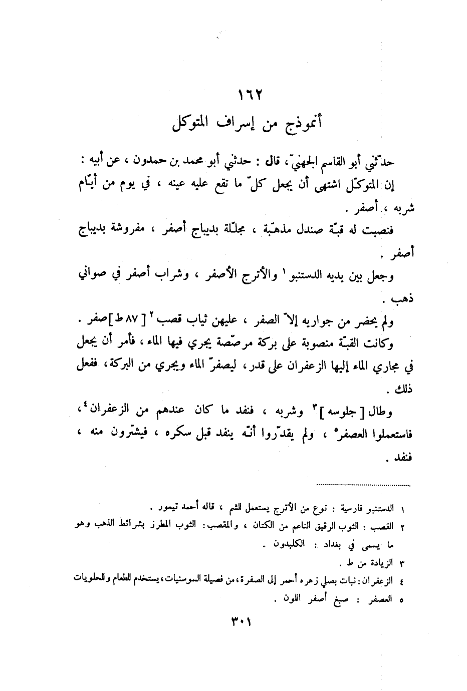 وطال [جلوسه] «3» وشربه، فنفد ما كان عندهم من الزعفران «4» ، فاستعملوا العصفر «5» ، ولم يقدّروا أنّه ينفد قبل سكره، فيشترون منه، فنفد.