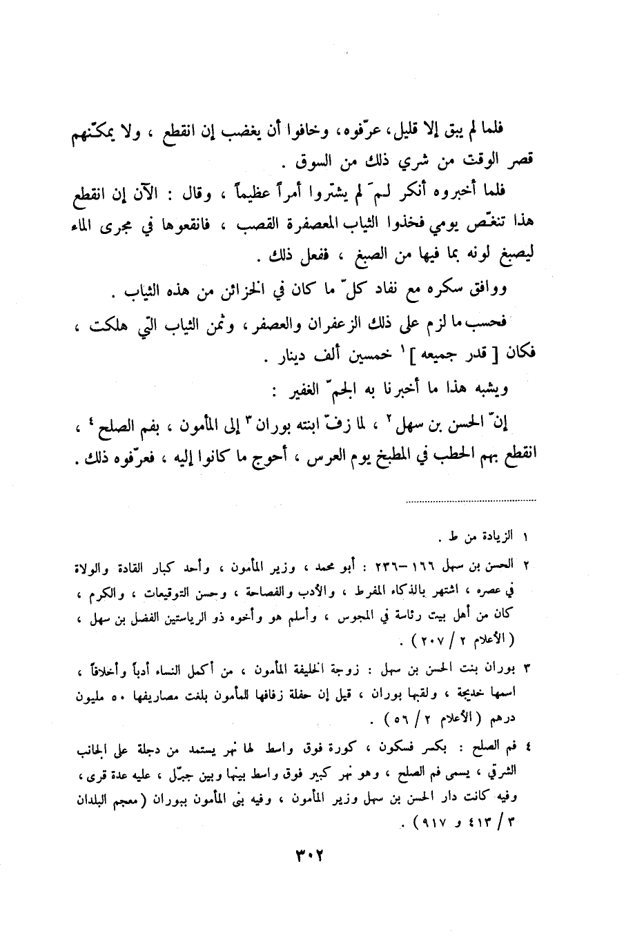 إنّ الحسن بن سهل «2» ، لما زفّ ابنته بوران «3» إلى المأمون، بفم الصلح «4» ، انقطع بهم الحطب في المطبخ يوم العرس، أحوج ما كانوا إليه، فعرّفوه ذلك.