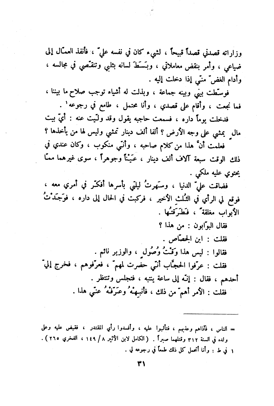 فعلمت أنّ هذا من كلام صاحبه، وأنّي منكوب، وكان عندي في ذلك الوقت سبعة آلاف ألف دينار، عينا وجوهرا، سوى غيرهما ممّا يحتوي عليه ملكي.