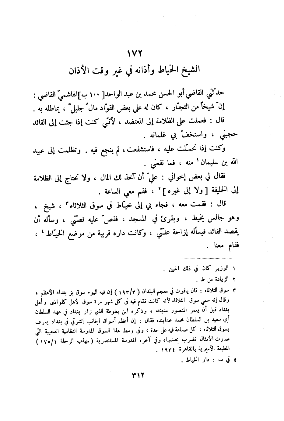 قال: فقمت معه، فجاء بي إلى خيّاط في سوق الثلاثاء «3» ، شيخ، وهو جالس يخيط، ويقرىء في المسجد، فقصّ عليه قصّتي، وسأله أن يقصد القائد فيسأله إزاحة علّتي، وكانت داره قريبة من موضع الخيّاط «4» ، فقام معنا.