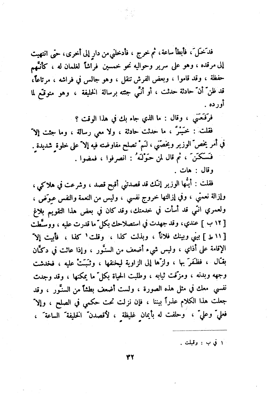 فقلت: أيّها الوزير إنّك قد قصدتني أقبح قصد، وشرعت في هلاكي، وإزالة نعمتي، وفي إزالتها خروج نفسي، وليس من النعمة والنفس عوض، ولعمري انّي قد أسأت في خدمتك، وقد كان في بعض هذا التقويم بلاغ [12 ب] عندي، وقد جهدت في استصلاحك بكلّ ما قدرت عليه، ووسّطت [11 ط] بيني وبينك فلانا، وبذلت كذا، وقلت «1» كذا، فأبيت إلّا الإقامة على أذاي، وليس شيء أضعف من السنّور، وإذا عاثت في دكّان بقّال، فظفر بها، ولزّها إلى الزاوية ليخنقها، وثبت عليه، فخدشت وجهه وبدنه، ومزّقت ثيابه، وطلبت الحياة بكلّ ما يمكنها، وقد وجدت نفسي معك في مثل هذه الصورة، ولست أضعف بطشا من السنّور، وقد جعلت هذا الكلام عذرا بيننا، فإن نزلت تحت حكمي في الصلح، وإلّا فعليّ وعليّ، وحلفت له بأيمان غليظة، لأقصدنّ الخليفة الساعة،