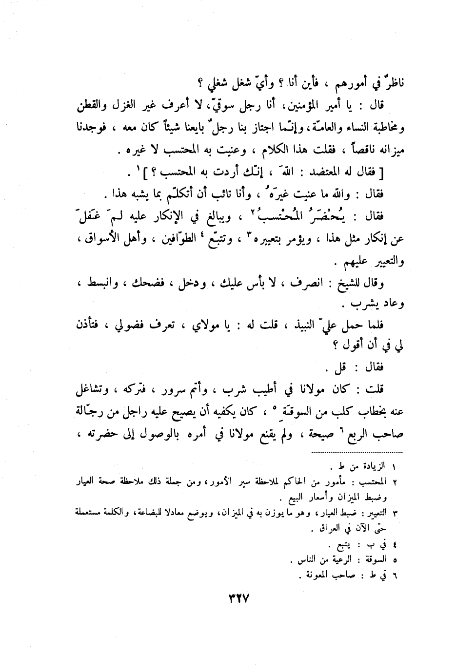 قال: يا أمير المؤمنين، أنا رجل سوقيّ، لا أعرف غير الغزل والقطن ومخاطبة النساء والعامّة، وإنّما اجتاز بنا رجل بايعنا شيئا كان معه، فوجدنا ميزانه ناقصا، فقلت هذا الكلام، وعنيت به المحتسب لا غيره.
