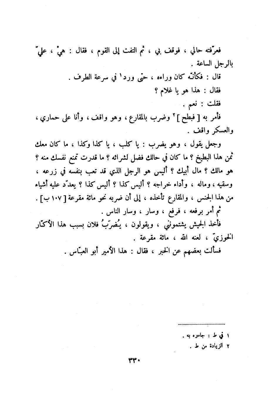 هو مالك؟ مال أبيك؟ أليس هو الرجل الذي قد تعب بنفسه في زرعه، وسقيه، وماله، وأداء خراجه؟ أليس كذا؟ أليس كذا؟ يعدّد عليه أشياء من هذا الجنس، والمقارع تأخذه، إلى أن ضربه نحو مائة مقرعة [107 ب] .