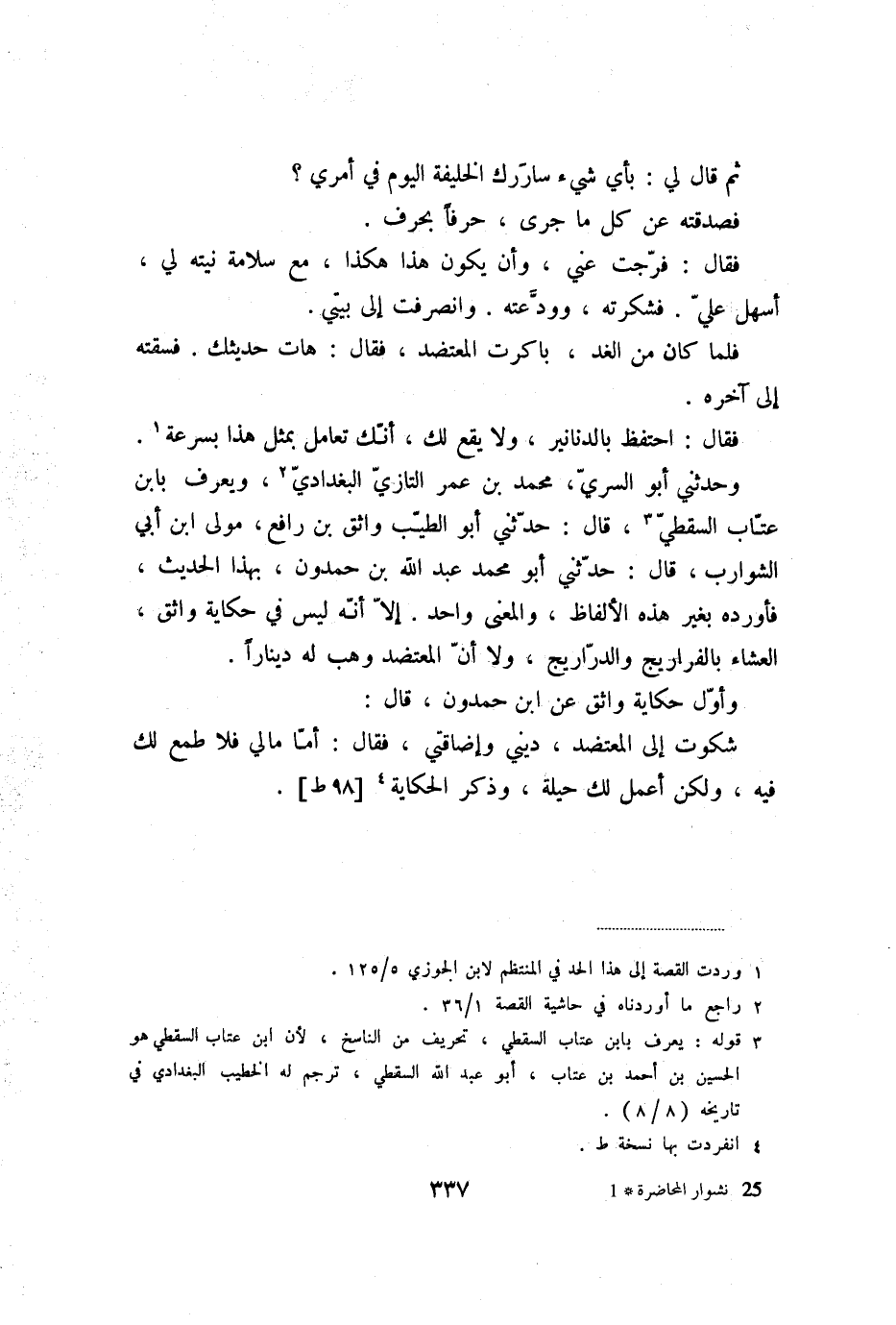 وحدثني أبو السريّ، محمد بن عمر التازيّ البغداديّ «2» ، ويعرف بابن عتّاب السقطيّ «3» ، قال: حدّثني أبو الطيّب واثق بن رافع، مولى ابن أبي الشوارب، قال: حدّثني أبو محمد عبد الله بن حمدون، بهذا الحديث، فأورده بغير هذه الألفاظ، والمعنى واحد. إلّا أنّه ليس في حكاية واثق، العشاء بالفراريج والدرّاريج، ولا أنّ المعتضد وهب له دينارا.