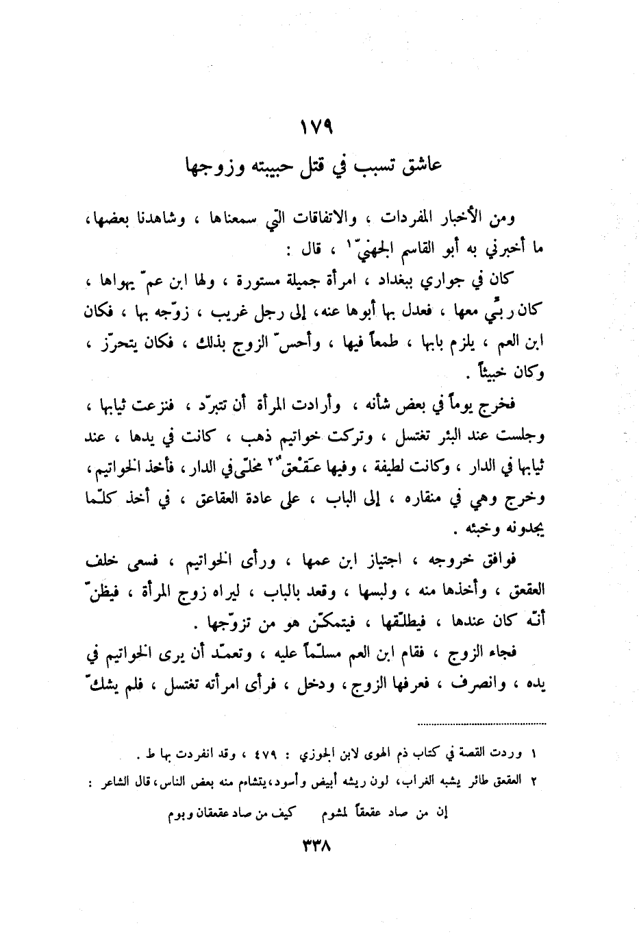 كان في جواري ببغداد، امرأة جميلة مستورة، ولها ابن عمّ يهواها، كان ربّي معها، فعدل بها أبوها عنه، إلى رجل غريب، زوّجه بها، فكان ابن العم، يلزم بابها، طمعا فيها، وأحسّ الزوج بذلك، فكان يتحرّز، وكان خبيثا.