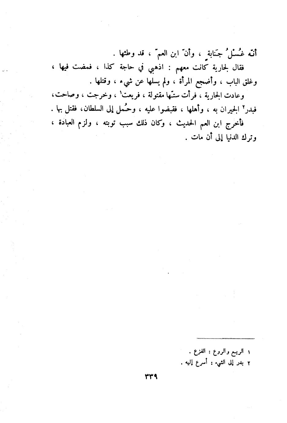 وعادت الجارية، فرأت ستّها مقتولة، فريعت «1» ، وخرجت، وصاحت، فبدر «2» الجيران به، وأهلها، فقبضوا عليه، وحمل إلى السلطان، فقتل بها، فأخرج ابن العم الحديث، وكان ذلك سبب توبته، ولزم العبادة، وترك الدنيا إلى أن مات.