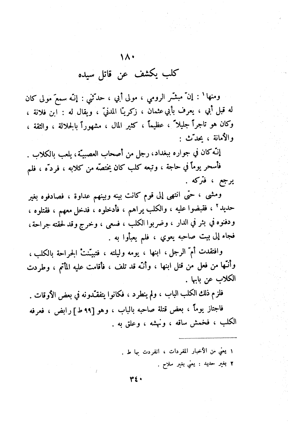 فاجتاز يوما، بعض قتلة صاحبه بالباب، وهو [99 ط] رابض، فعرفه الكلب، فخمش ساقه، ونهشه، وعلق به.