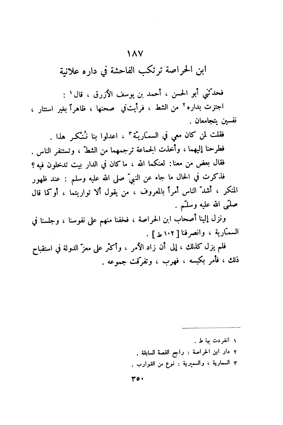ونزل إلينا أصحاب ابن الحراصة، فخفنا منهم على نفوسنا، وجلسنا في السمارية، وانصرفنا [102 ط] .