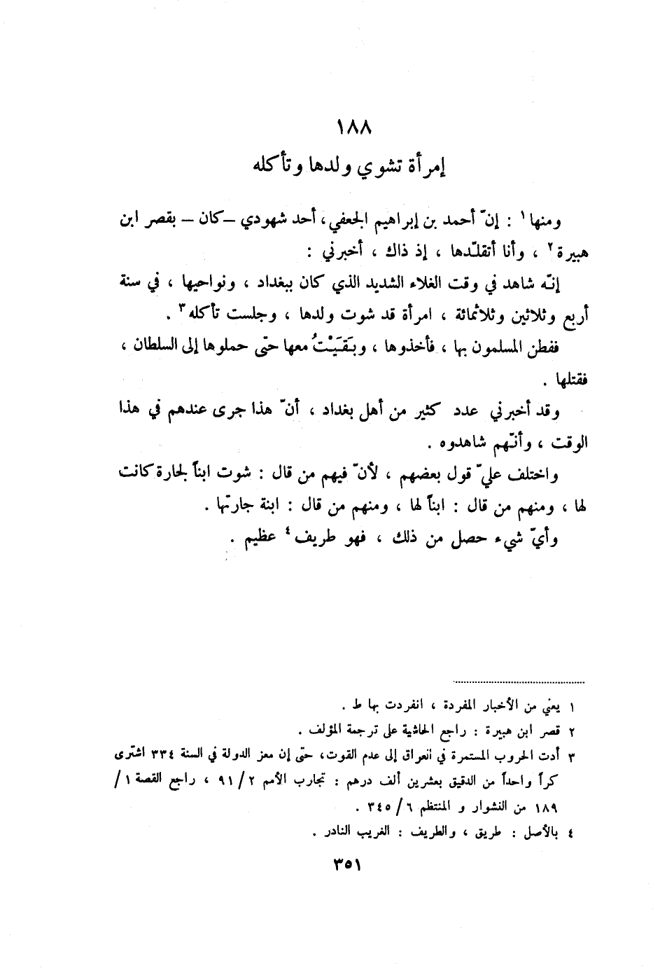 إنّه شاهد في وقت الغلاء الشديد الذي كان ببغداد، ونواحيها، في سنة أربع وثلاثين وثلاثمائة، امرأة قد شوت ولدها، وجلست تأكله «3» .
