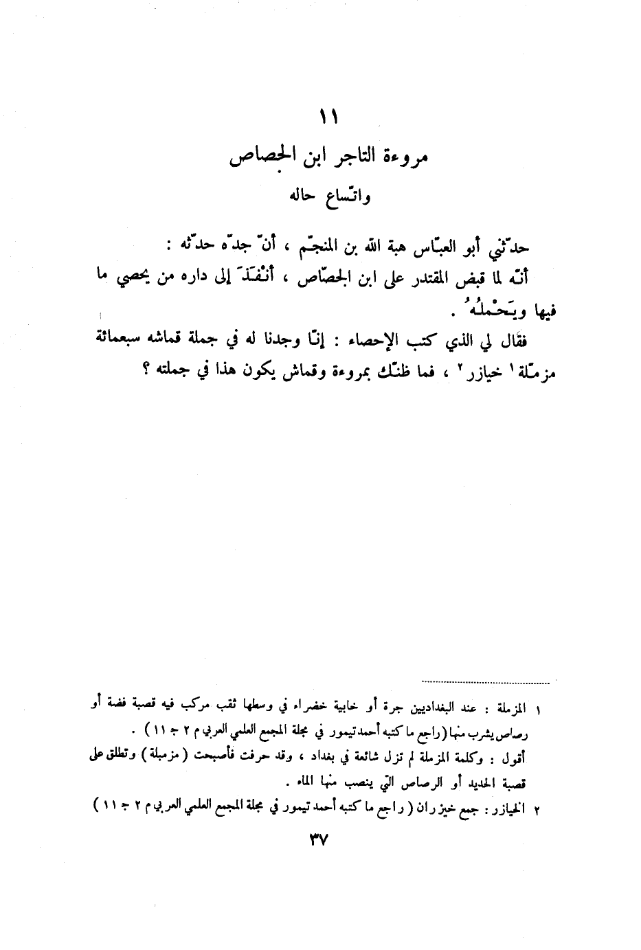 فقال لي الذي كتب الإحصاء: إنّا وجدنا له في جملة قماشه سبعمائة مزمّلة «1» خيازر «2» ، فما ظنّك بمروءة وقماش يكون هذا في جملته؟