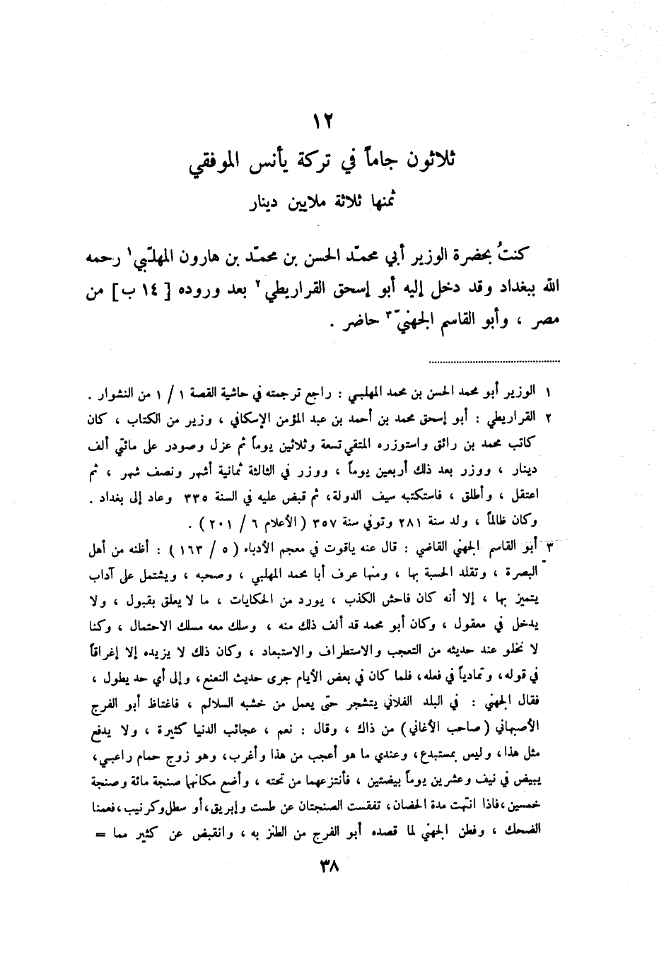 كنت بحضرة الوزير أبي محمّد الحسن بن محمّد بن هارون المهلّبي «1» رحمه الله ببغداد وقد دخل إليه أبو إسحق القراريطي «2» بعد وروده [14 ب] من مصر، وأبو القاسم الجهنيّ «3» حاضر.