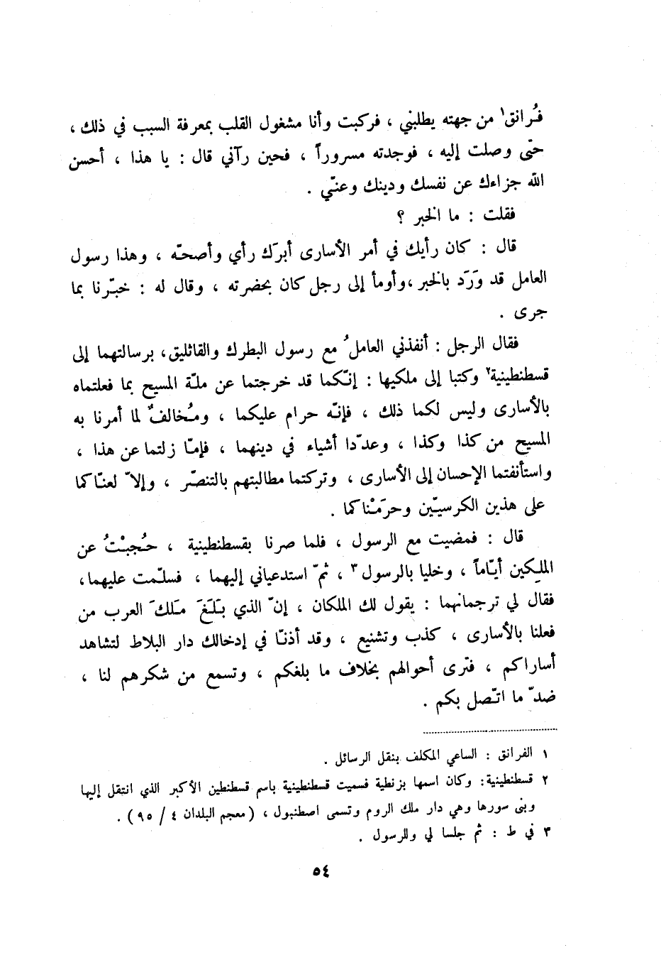قال: فمضيت مع الرسول، فلما صرنا بقسطنطينية، حجبت عن الملكين أيّاما، وخليا بالرسول «3» ، ثمّ استدعياني إليهما، فسلّمت عليهما، فقال لي ترجمانهما: يقول لك الملكان، إنّ الذي بلغ ملك العرب من فعلنا بالأسارى، كذب وتشنيع، وقد أذنّا في إدخالك دار البلاط لتشاهد أساراكم، فترى أحوالهم بخلاف ما بلغكم، وتسمع من شكرهم لنا، ضدّ ما اتّصل بكم.