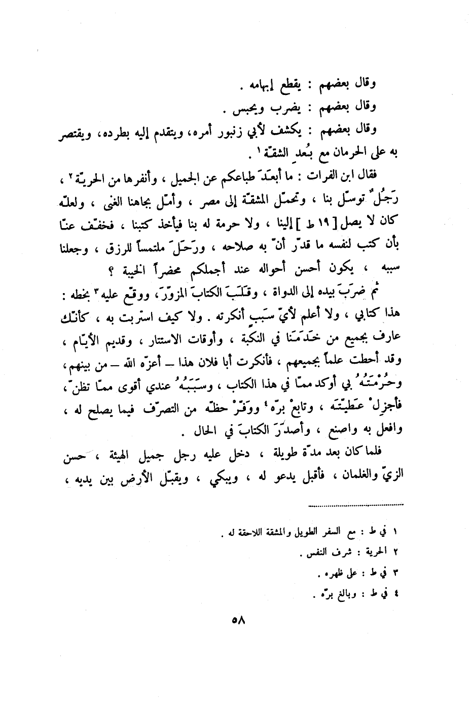 فقال ابن الفرات: ما أبعد طباعكم عن الجميل، وأنفرها من الحرّية «2» ، رجل توسّل بنا، وتحمّل المشقّة إلى مصر، وأمّل بجاهنا الغنى، ولعلّه كان لا يصل [19 ط] إلينا، ولا حرمة له بنا فيأخذ كتبنا، فخفّف عنّا بأن كتب لنفسه ما قدّر أنّ به صلاحه، ورحل ملتمسا للرزق، وجعلنا سببه، يكون أحسن أحواله عند أجملكم محضرا الخيبة؟