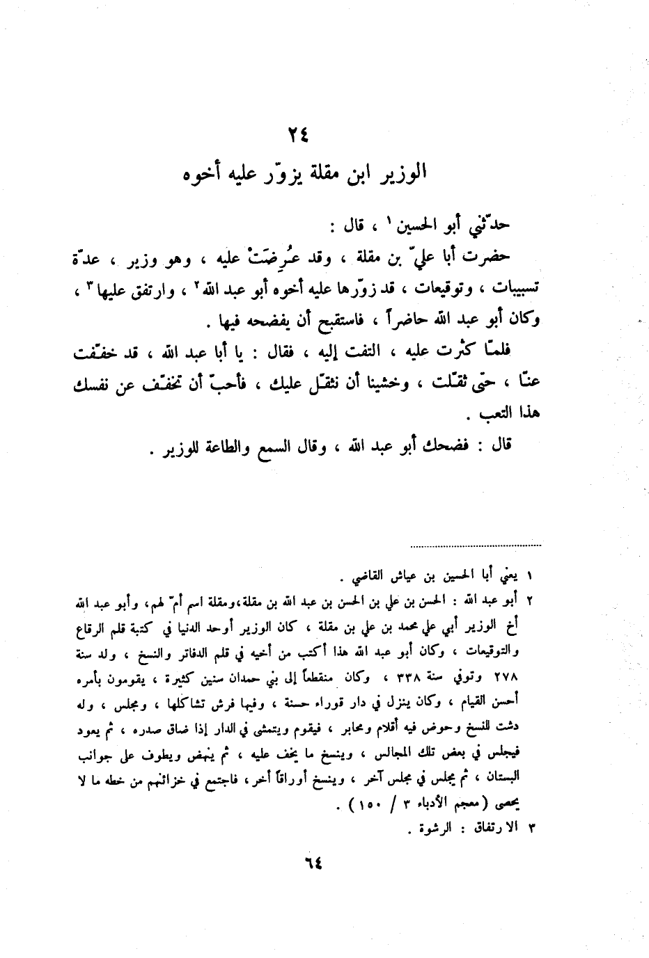 حضرت أبا عليّ بن مقلة، وقد عرضت عليه، وهو وزير، عدّة تسبيبات، وتوقيعات، قد زوّرها عليه أخوه أبو عبد الله «2» ، وارتفق عليها «3» ، وكان أبو عبد الله حاضرا، فاستقبح أن يفضحه فيها.
