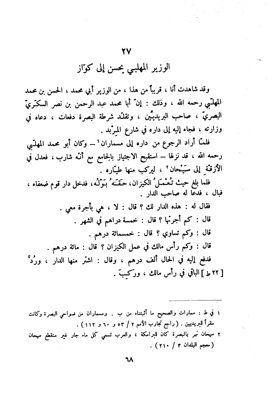فلمّا أراد الرجوع من داره إلى مسماران «1» - وكان أبو محمد المهلّبي رحمه الله، قد نزلها- استقبح الاجتياز بالجامع مع أنّه شارب، فعدل في الأزقّة إلى سيحان «2» ، ليركب منها طيّاره.