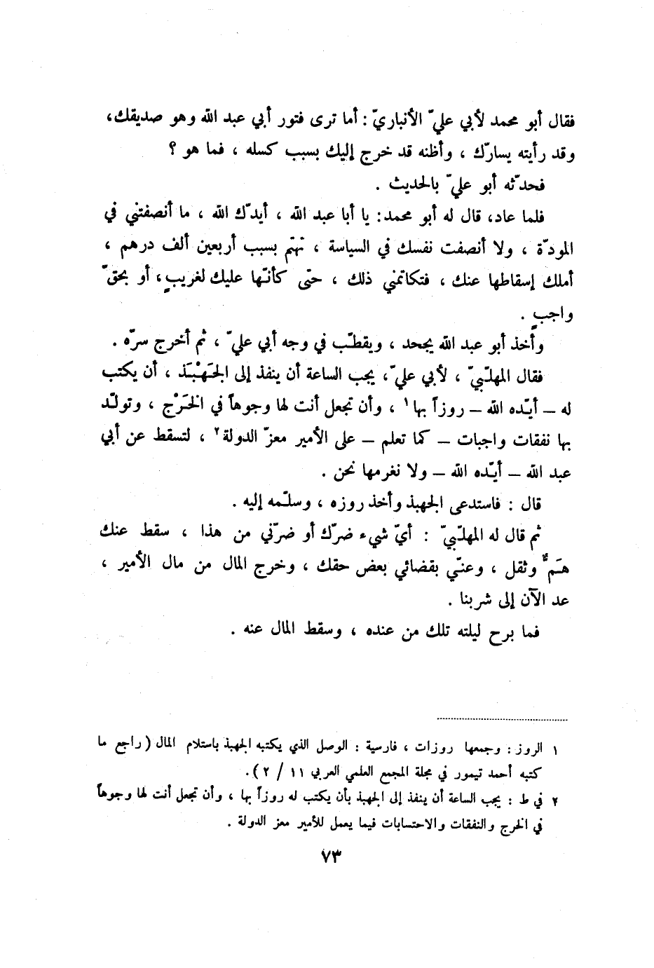فقال المهلّبيّ، لأبي عليّ، يجب الساعة أن ينفذ إلى الجهبذ، أن يكتب له- أيّده الله- روزا بها «1» ، وأن تجعل أنت لها وجوها في الخرج، وتولّد بها نفقات واجبات- كما تعلم- على الأمير معزّ الدولة «2» ، لتسقط عن أبي عبد الله- أيّده الله- ولا نغرمها نحن.