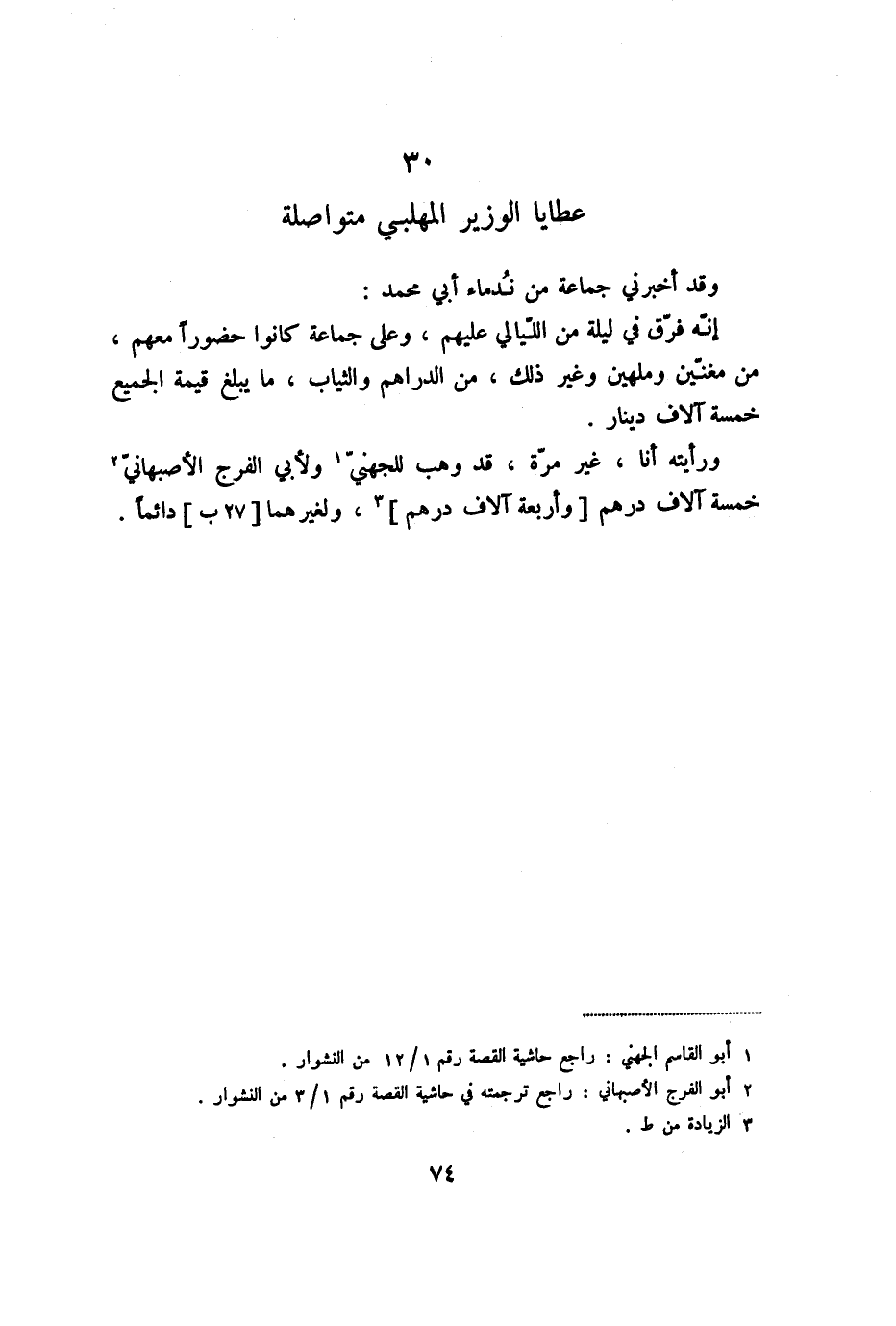 ورأيته أنا، غير مرّة، قد وهب للجهنيّ «1» ولأبي الفرج الأصبهانيّ «2» خمسة آلاف درهم [وأربعة آلاف درهم] «3» ، ولغيرهما [27 ب] دائما.