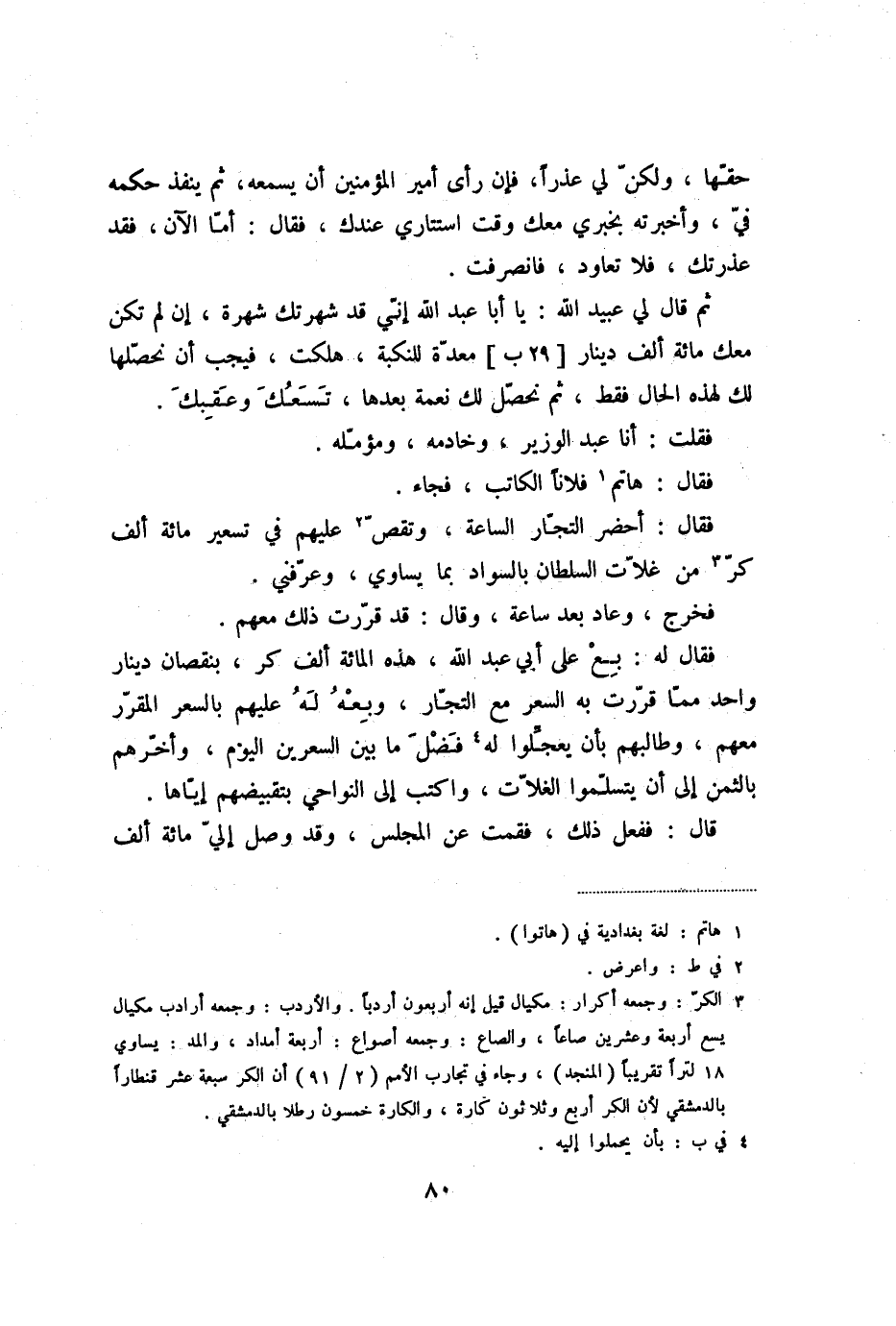 فقال: أحضر التجّار الساعة، وتقصّ «2» عليهم في تسعير مائة ألف كرّ «3» من غلّات السلطان بالسواد بما يساوي، وعرّفني.