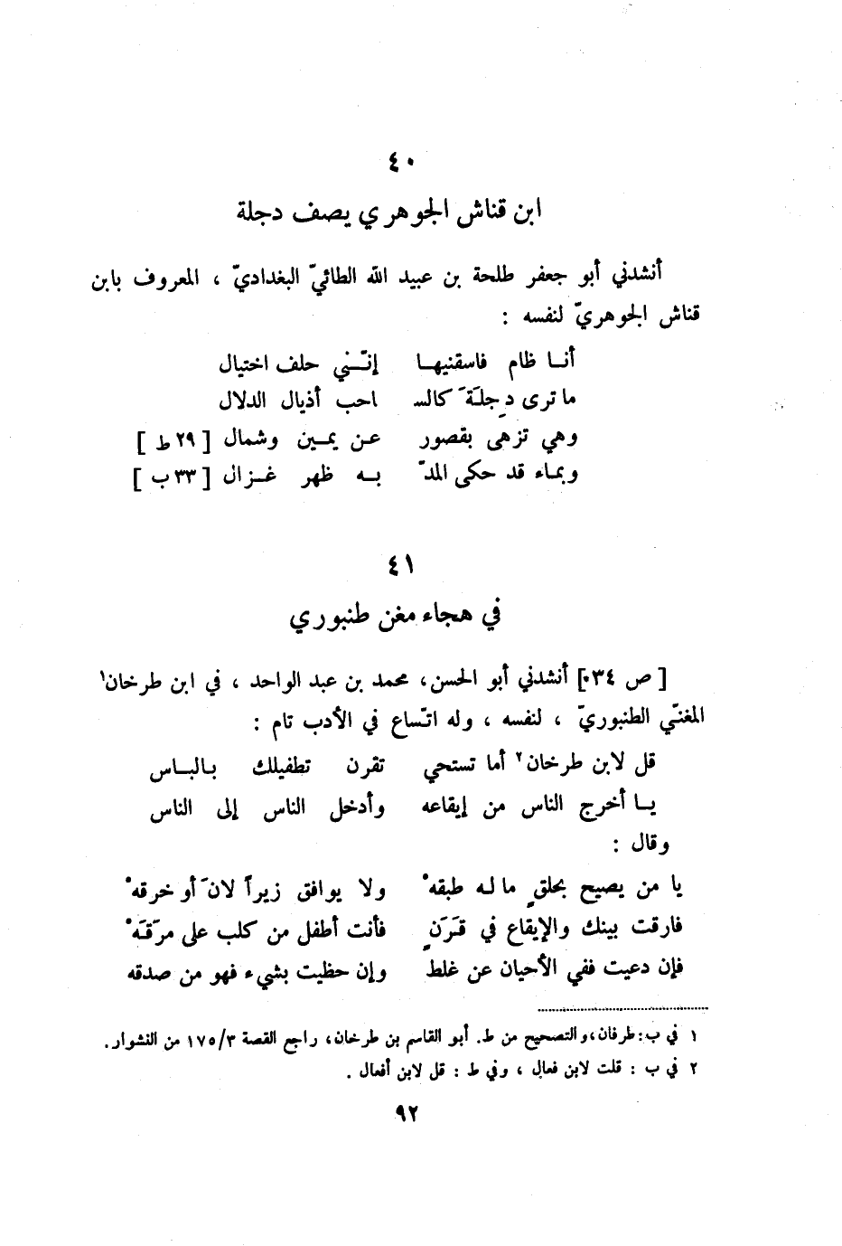 [ص 34] أنشدني أبو الحسن، محمد بن عبد الواحد، في ابن طرخان «1» المغنّي الطنبوريّ، لنفسه، وله اتّساع في الأدب تام: