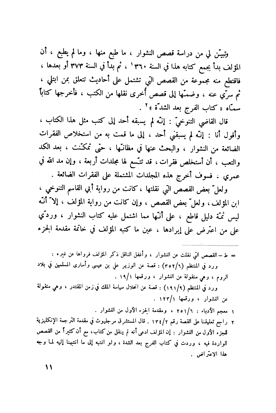 وتبيّن لي من دراسة قصص النشوار، ما طبع منها، وما لم يطبع، أن المؤلف بدأ بجمع كتابه هذا في السنة 360 «1» ، ثم بدأ في السنة 373 أو بعدها، فاقتطع منه مجموعة من القصص التي تشتمل على أحاديث تتعلق بمن ابتلي، ثم سرّي عنه، وضمّها إلى قصص أخرى نقلها من الكتب، فأخرجها كتابا سمّاه «كتاب الفرج بعد الشدّة» «2» .