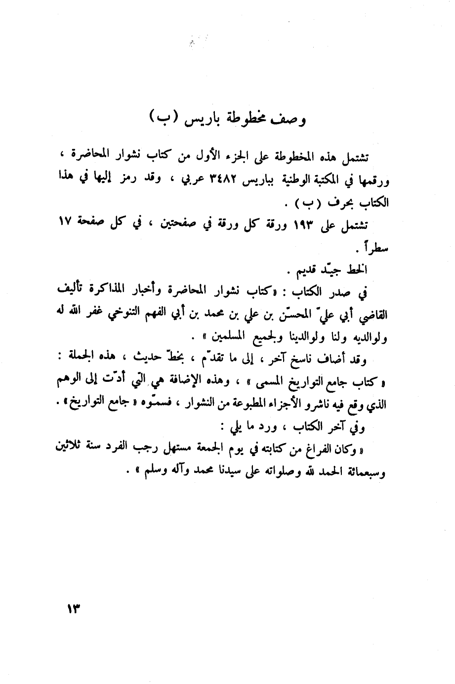تشتمل هذه المخطوطة على الجزء الأول من كتاب نشوار المحاضرة، ورقمها في المكتبة الوطنية بباريس 3482 عربي، وقد رمز إليها في هذا الكتاب بحرف (ب) .
