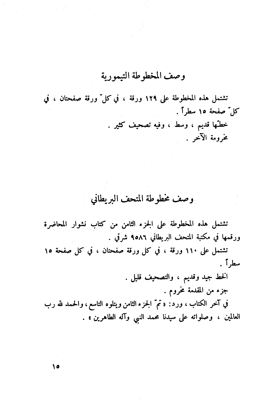 تشتمل هذه المخطوطة على الجزء الثامن من كتاب نشوار المحاضرة ورقمها في مكتبة المتحف البريطاني 9586 شرقي.