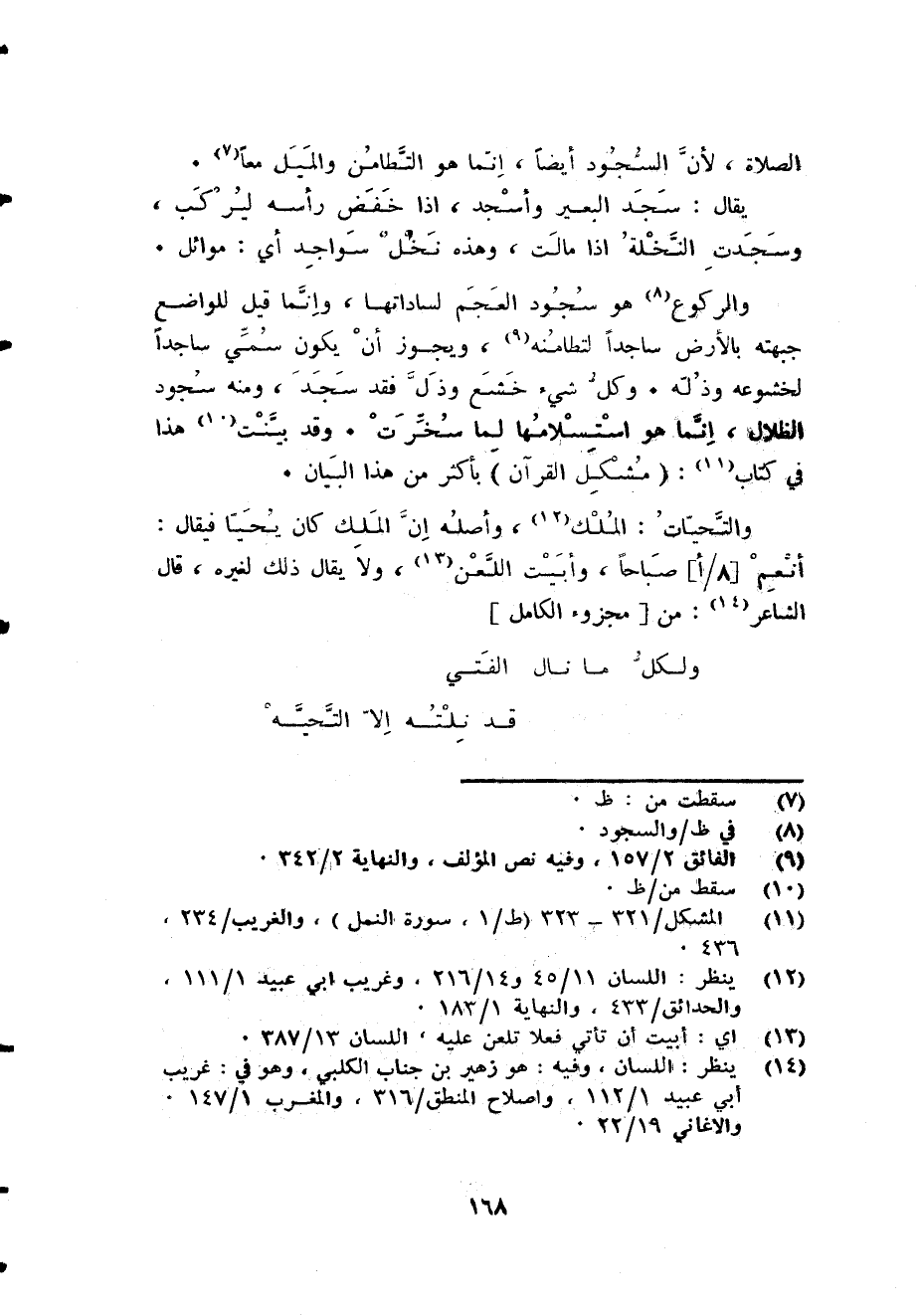 وَالرُّكُوع هُوَ سُجُود الْعَجم لساداتها وَإِنَّمَا قيل للواضع جَبهته بِالْأَرْضِ سَاجِدا لتطامنه وَيجوز أَن يزن سمي سَاجِدا لخشوعه وذله. وكل شَيْء خشع وذل فقد سجد وَمِنْه سُجُود الظلال إِنَّمَا هُوَ استسلامها لما سخرت وَقد بيّنت هَذَا فِي كتاب [مُشكل الْقُرْآن] بِأَكْثَرَ من هَذَا الْبَيَان.