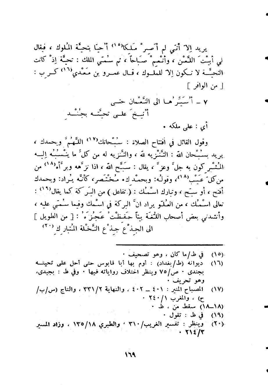 وَقَول الْقَائِل فِي افْتِتَاح الصَّلَاة سُبْحَانَكَ اللَّهُمَّ وَبِحَمْدِك يُرِيد بسبحان الله التَّنْزِيه لله والتنزيه لَهُ من كل مَا ينْسبهُ إِلَيْهِ الْمُشْركُونَ بِهِ جلّ وَعز يُقَال سبح الله إِذا نزهه وبرأه من من كل عيب وَقَوله وَبِحَمْدِك مُخْتَصر كَأَنَّهُ يُرَاد وَبِحَمْدِك أفتح أَو سبح وتبارك اسْمك (تفَاعل) مَعَ الْبركَة كَمَا يُقَال تَعَالَى اسْمك من الْعُلُوّ يُرَاد أَن الْبركَة فِي اسْمك وَفِيمَا سمي عَلَيْهِ وأنشدني بعض أَصْحَاب أللغة بَيْتا حفظت عَجزه [من الطَّوِيل] ... إِلَى الْجذع جذع النَّخْلَة المتبارك