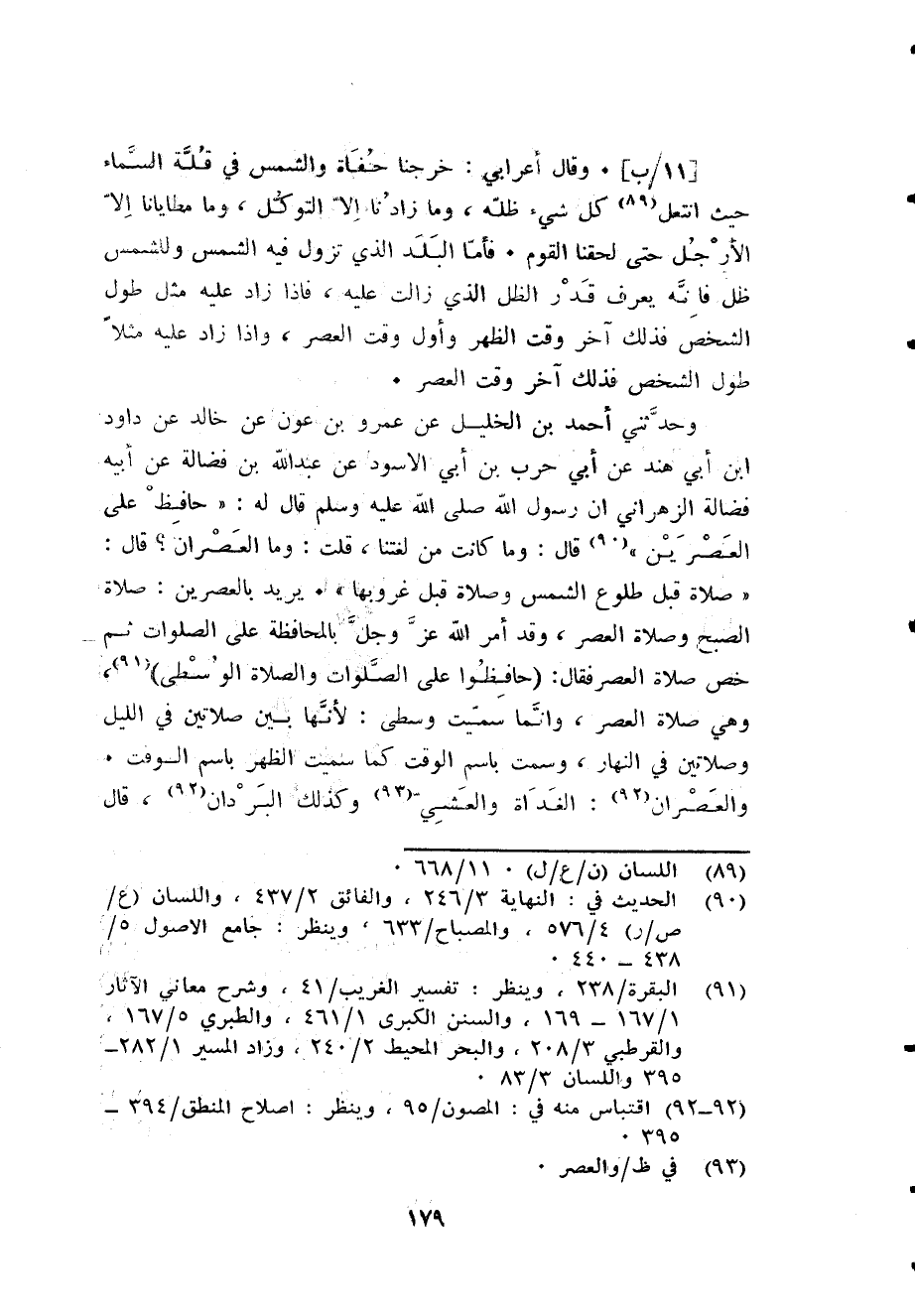 وحَدثني أَحْمد بن الْخَلِيل عَن عَمْرو ابْن عون عَن خَالِد عَن دَاوُد بن أبي هِنْد عَن أبي حَرْب بن أبي الْأسود عَن عبد الله بن فضَالة عَن أَبِيه فضَالة الزهْرَانِي أَن رَسُول الله صلى الله عَلَيْهِ وَسلم قَالَ لَهُ: حَافظ على العصرين قَالَ وَمَا كَانَت من لغتنا قلت وَمَا العصران قَالَ: صَلَاة قبل طُلُوع الشَّمْس وَصَلَاة قبل غُرُوبهَا يُرِيد بالعصرين صَلَاة الصُّبْح وَصَلَاة الْعَصْر وَقد أَمر الله عز وَجل بالمحافظة على الصَّلَوَات ثمَّ خص صَلَاة الْعَصْر فَقَالَ: {حَافظُوا على الصَّلَوَات وَالصَّلَاة الْوُسْطَى} وَهِي صَلَاة الْعَصْر وَإِنَّمَا سميت وسطى لِأَنَّهَا بَين صَلَاتَيْنِ فِي اللَّيْل وصلاتين فِي النَّهَار وسمت باسم الْوَقْت كَمَا سميت الظّهْر باسم الْوَقْت والعصران الْغَدَاة والعشي وَكَذَلِكَ البردان قَالَ