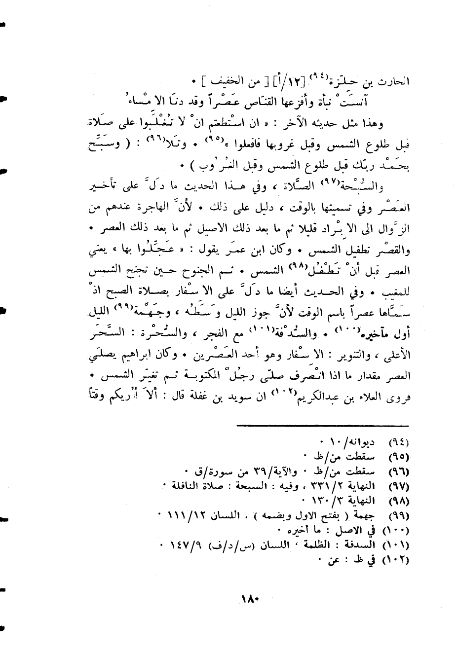 والسبحة الصَّلَاة وَفِي هَذَا الحَدِيث مَا دلّ على تَأْخِير الْعَصْر وَفِي تَسْمِيَتهَا بِالْوَقْتِ دَلِيل على ذَلِك لِأَن الهاجرة عِنْدهم من الزَّوَال إِلَى الْإِبْرَاد قَلِيلا ثمَّ مَا بعد ذَلِك الْأَصِيل ثمَّ مَا بعد ذَلِك الْعَصْر وَالْقصر تطفيل الشَّمْس وَكَانَ ابْن عمر يَقُول: عجلوا بهَا يَعْنِي الْعَصْر قبل أَن تطفل الشَّمْس ثمَّ الجنوح حِين تجنح الشَّمْس للمغيب وَفِي الحَدِيث أَيْضا مَا دلّ على الْإِسْفَار بِصَلَاة الصُّبْح إِذْ سَمَّاهَا عصرا باسم الْوَقْت لِأَن جوز اللَّيْل وَسطه وجهمة اللَّيْل أول مآخيره والسدفة مَعَ الْفجْر والسحرة السحر الْأَعْلَى والتنوير الْإِسْفَار وَهُوَ أحد العصرين وَكَانَ إِبْرَاهِيم يُصَلِّي الْعَصْر مِقْدَار مَا إِذا انْصَرف صلى رجل المكتوبه ثمَّ تغير الشَّمْس فروى الْعَلَاء بن عبد الكريم أَن سُوَيْد بن غَفلَة قَالَ أَلا أريكم وقتا